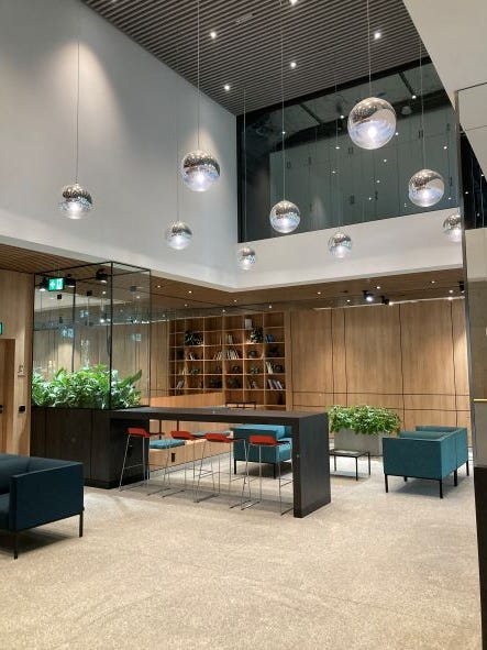 You enter the building through automatic revolving doors and into a sleek modern lobby: