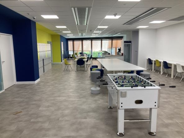 The other end of the hallway hosts the canteen/lunch counter, lunch seating area, and a foosball table (there’s going to be a digital piano somewhere in the hall, too):