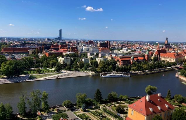 On the south side of the Odra River, you’re walking through the Stare Miastro (Old City), past the beautiful market square. (In the map above, you can see a half-circle of canals and trees that define the southern border of the Stare Miastro).