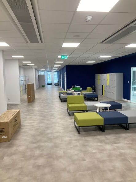 From here, you can use a key card to enter the school’s reception area on the ground floor (just out of sight to the right of the photo above)—here you’ll find the main office, the principal’s office, the computer servers, a conference room, and (for some reason) the science lab classroom. All the other classrooms and student spaces are on the third floor.