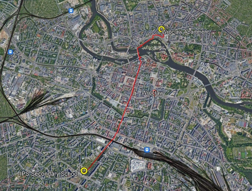 It’s just over two miles from our apartment to the school—about 45 minutes walking time right down Swidnicka through the center of the city: