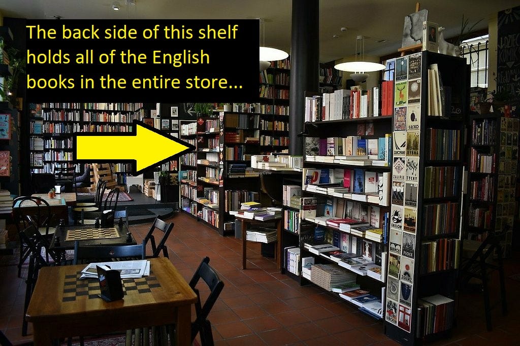 First, a look at Tajne Komplety (TIE-neh kom-PLET-eh), a cafe and księgarnia (k’shen-GAR-nyah)—bookstore—that happens to have two shelves of books in English. (It’s the only bookstore with any English books in Wrocław, I think):