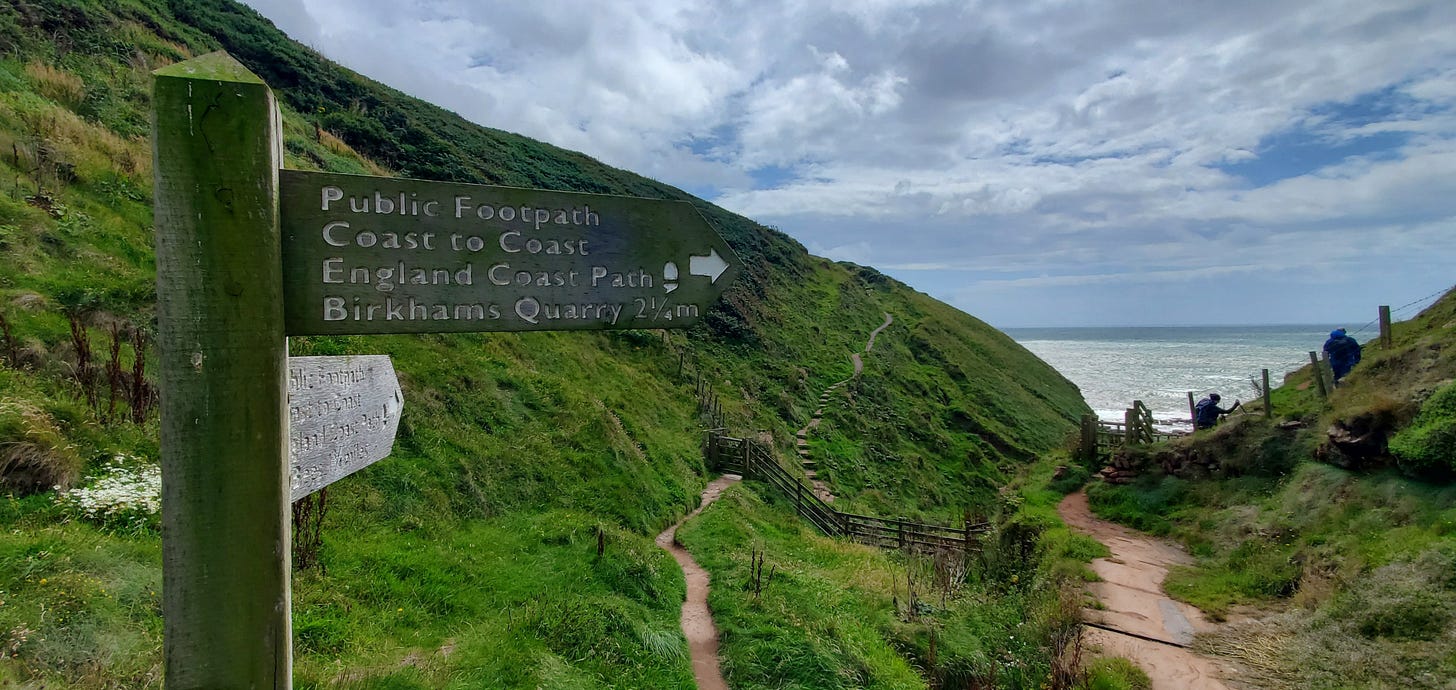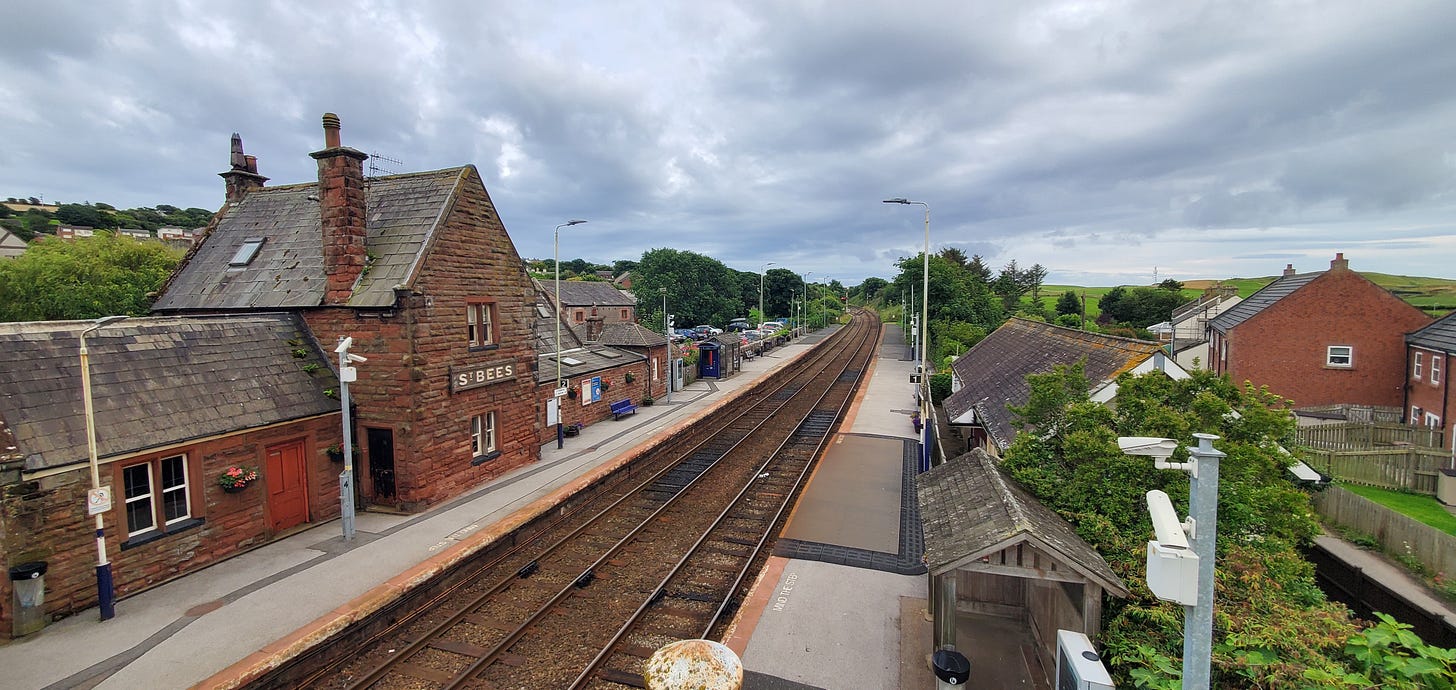 The normal route for the Coast to Coast Path begins in the seaside village of St. Bees (most people walk west-to-east so the prevailing winds—and the rain—are behind you). Imagine, if you will, the delights of a national rail system with service to small towns (about 1,8oo people in the 2021 census)—very handy indeed for those of us without cars.