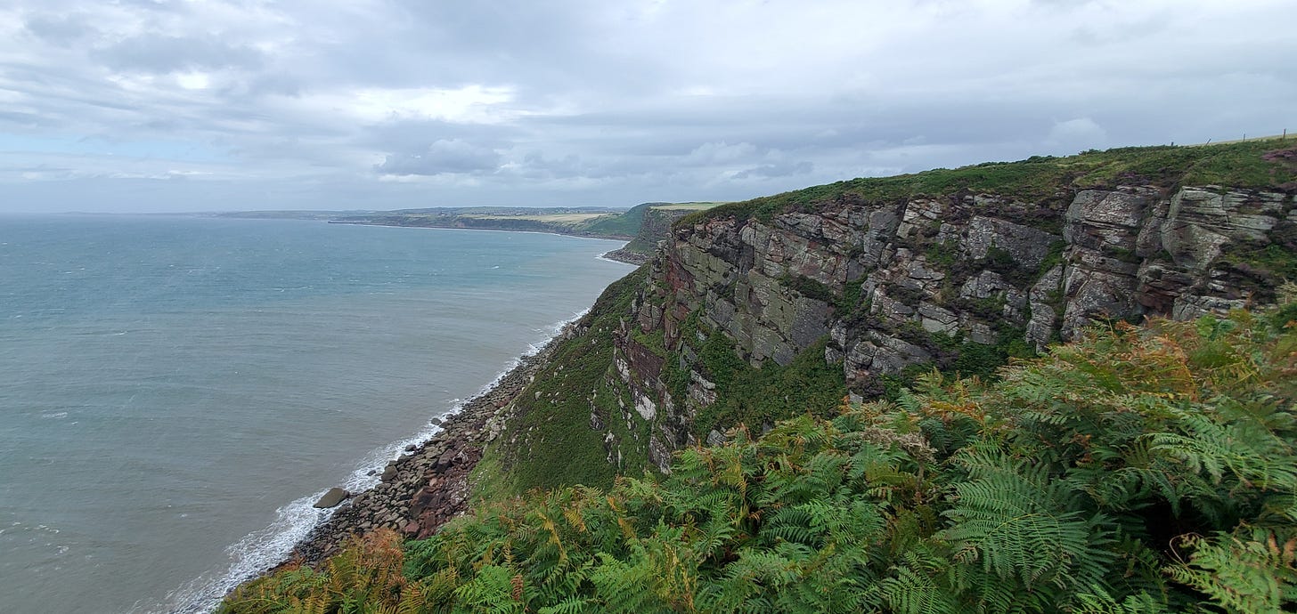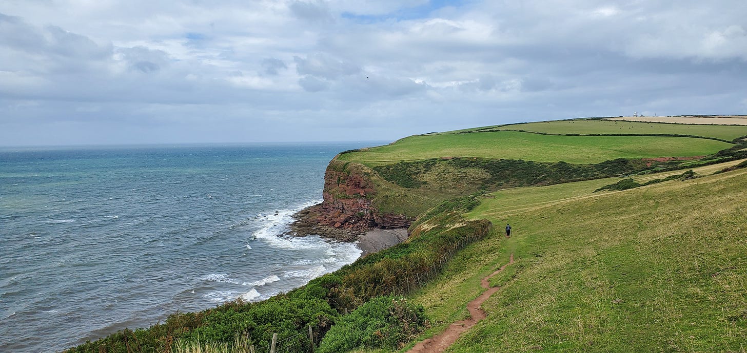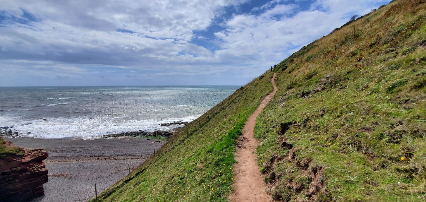 From the beach at St. Bees, the trail begins with a climb to the clifftops, and then follows the cliff edge closely: