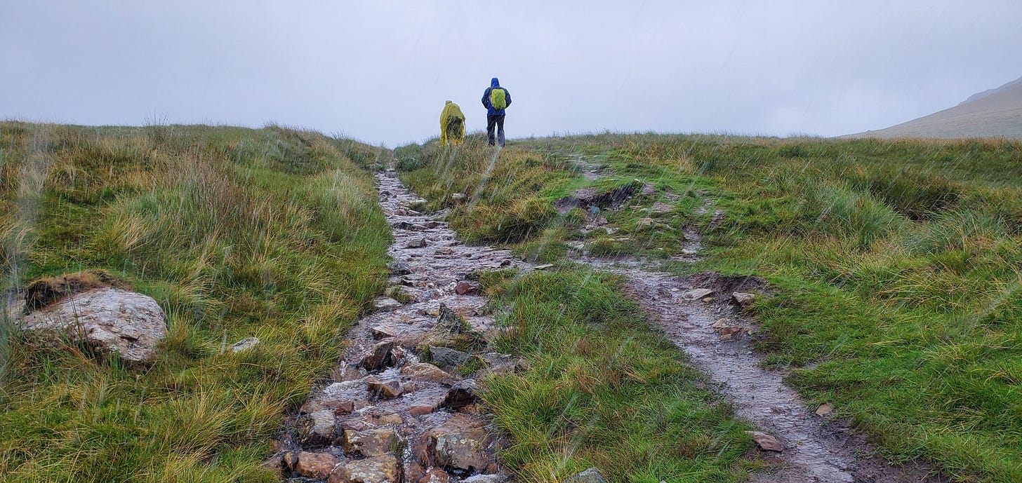 That ought to tell you something about the level of decadence we were forced to endure on this trip, which was the barest pale shadow of the dirtbag wilderness backpacking experiences of my past. We stayed in hostels or B&Bs each night, and even hired a van to carry our luggage, leaving us to carry only a small daypack for water bottles, snacks, and rain gear. And, well, actually, we rarely had to carry rain gear.