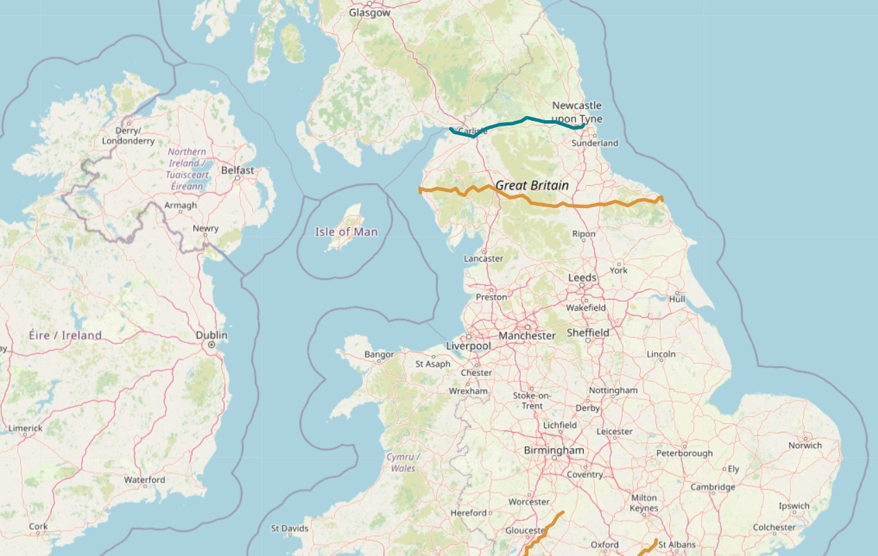 Even with a cat on your lap, there’s ample time to share a bit about our experiences this past summer on the Wainright Coast to Coast Path that I mentioned in our last update. This is a (theoretically) 192-mile route (not an official national trail quite yet) that runs through the north of England, from the Irish Sea on the west coast to the North Sea on the east. On the map below, it’s pretty much the orange line: