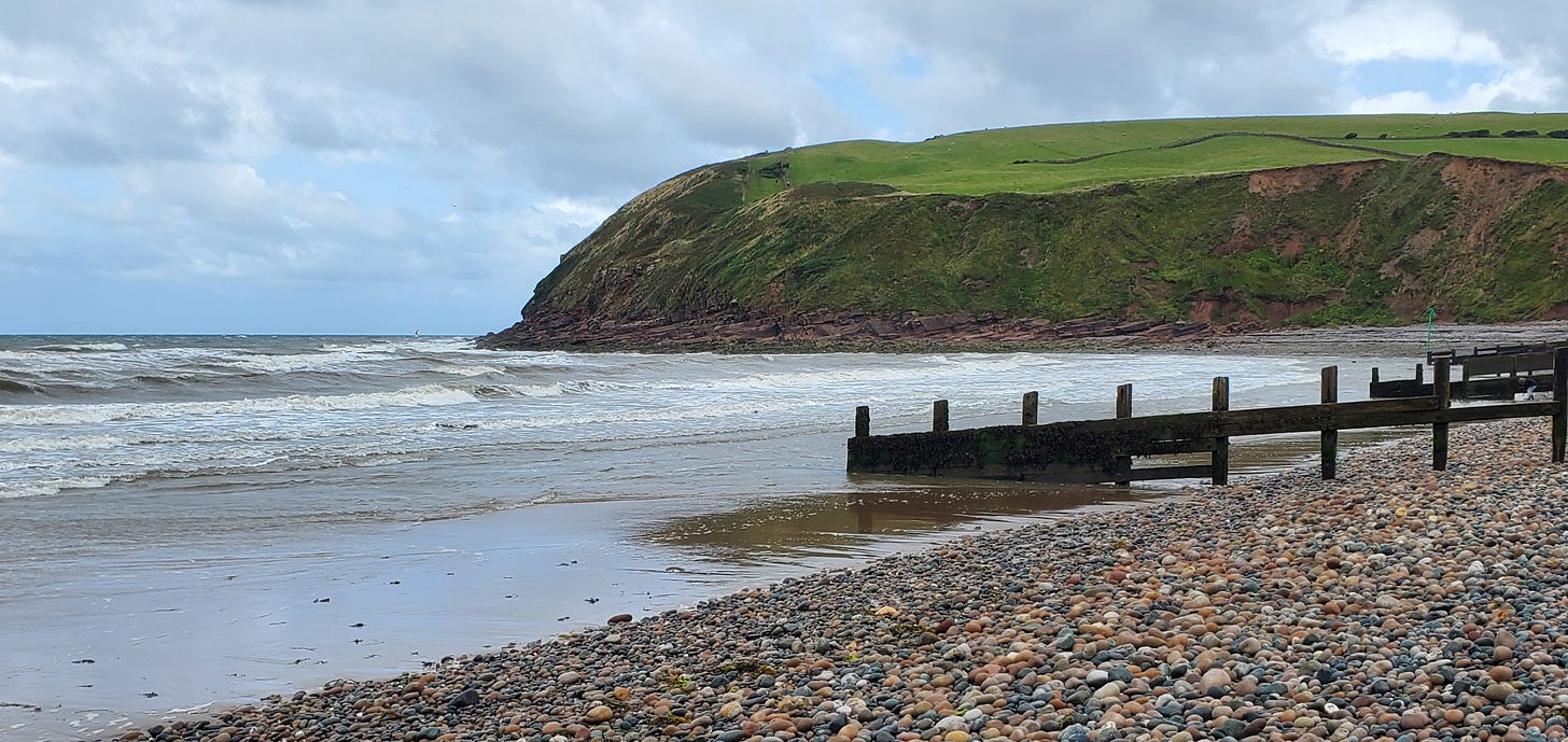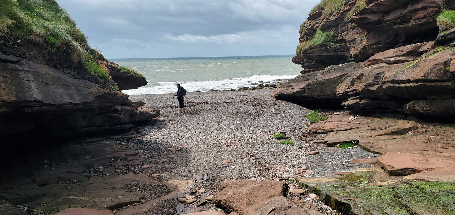 The best part of our hike to St. Bees Head on Day 0 was the beach at Fleswick Bay--a little pocket of beach just off the trail about halfway along, where a trickle of a creek--sorry, in northern England that'd be a "beck"--opened up a narrow access gully down to the Irish Sea.