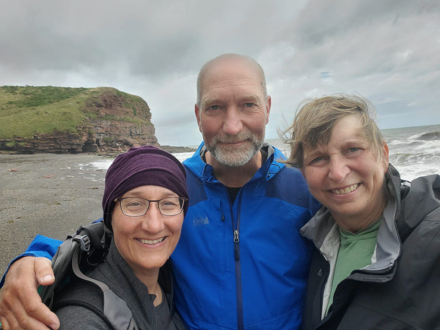 It’s not often you get the chance to walk all the way across a country, so my sister Mary joined us for the trip. It was great to have her, and not only for her beautiful photos (almost all of the photos on this post are hers). Going way back to her high school days, Mary was forced to drag her annoying little brother (that’s me) on lots of outings—she and her friends were always nice about it, but still…—so it was great to repay her many kindnesses by having her join us for this one. Let’s start with a quick look at the team (l-r: Cathy, Tom, Mary):