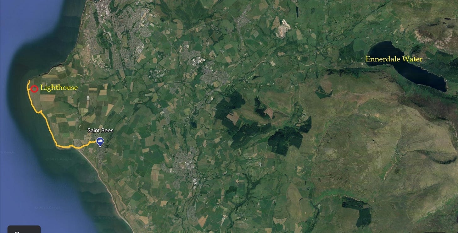 Day 1 of the Wainwright route traditionally follows a coastal path north from St. Bees, up to the lighthouse at St. Bees head, then cuts inland toward the Lake District, usually ending up somewhere around Ennerdale Water for the first night, covering far more distance than needed if you were to walk directly from St. Bees to Ennerdale Water.