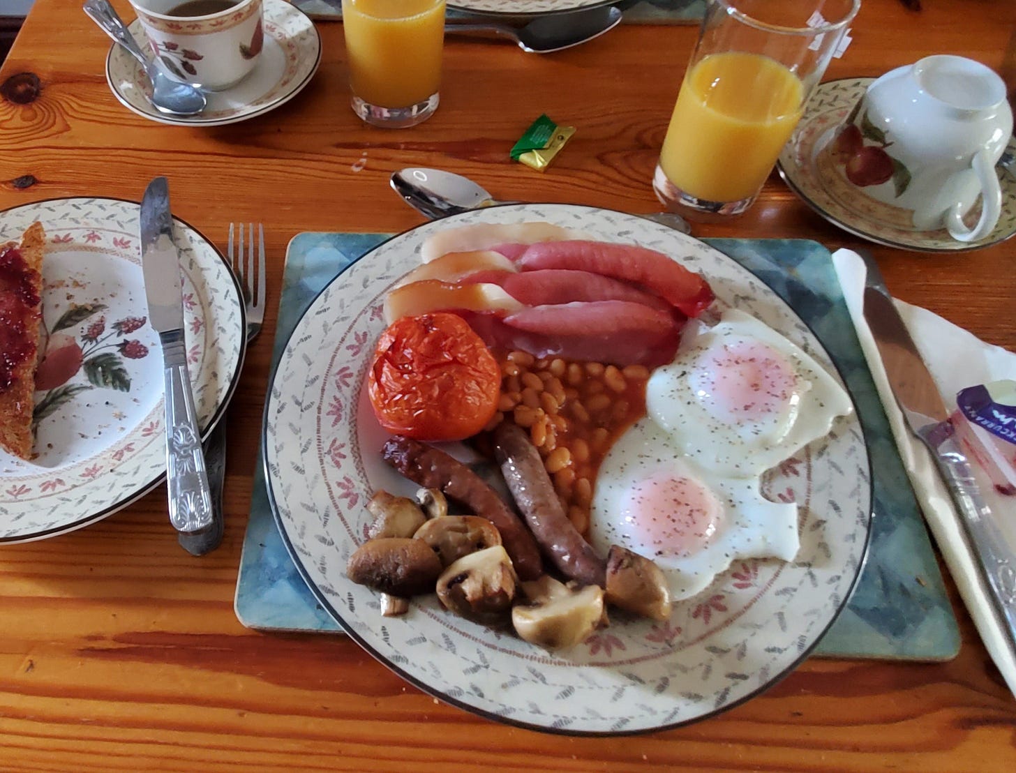 That’s the traditional full English breakfast, or the “full English” as those of us with a dash of pretension like to say: 2 eggs, 2 sausages, 2 slices of what the British call bacon (more like ham to American breakfasters), roast tomato, toast, coffee, juice, and (the horror!) baked beans (to which I say: No. Just, no.) Mushrooms are not uncommon, but seem more optional than the rest.